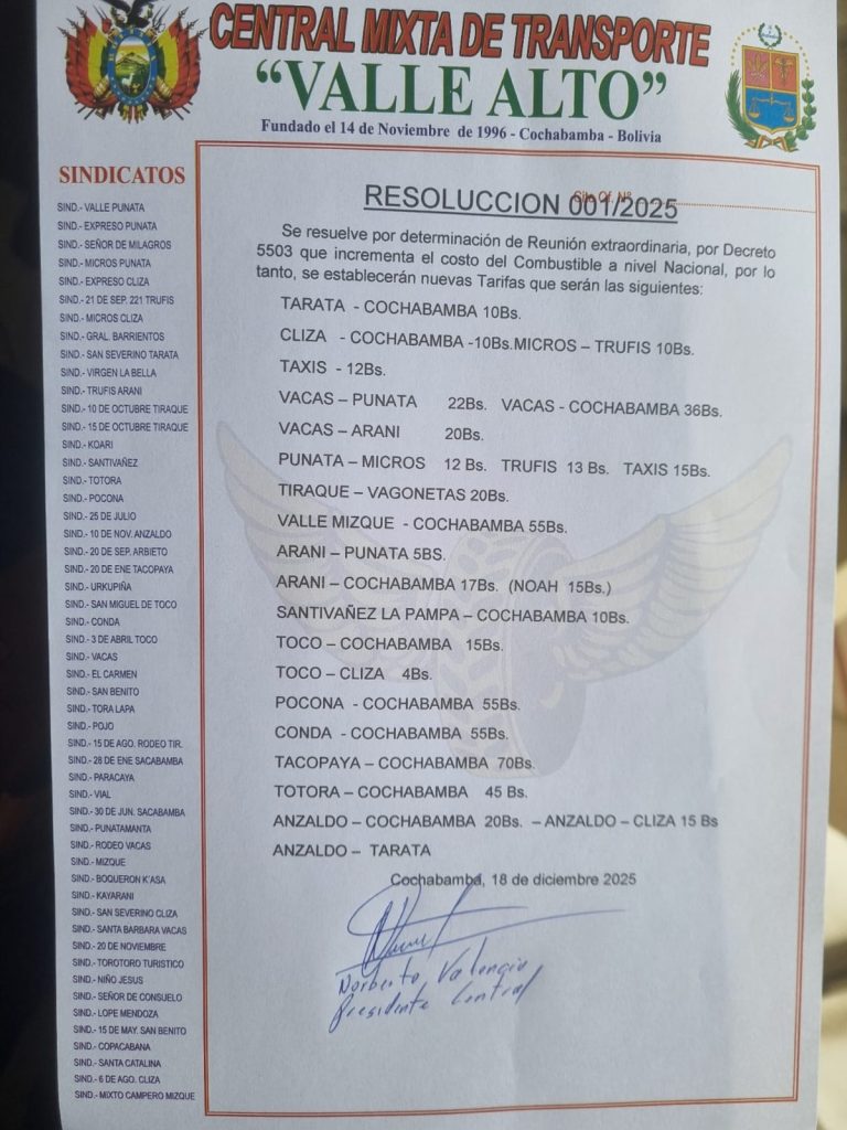 El incremento que se dio a conocer la jornada pasada, por parte de la Central del Valle Alto, con los nuevos costos del transporte interprovincial, desde los distintos municipios a la ciudad de Cochabamba, quedará en pausa, a la espera de la reunión.